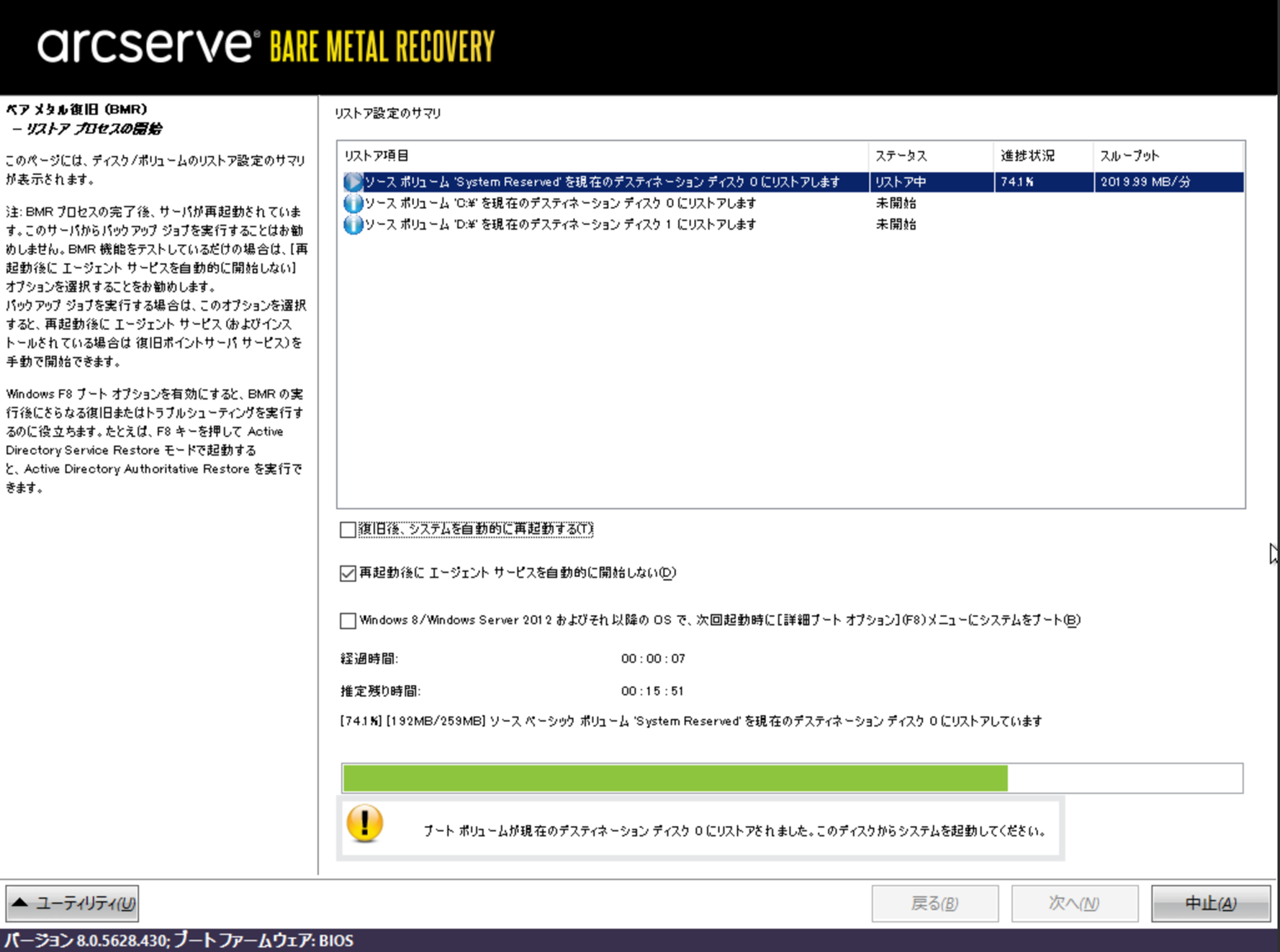 リストアが開始されます。「復旧後、システムを自動的に再起動する」のチェックを外します。(リストア用のインスタンスでは再起動は不要です。)