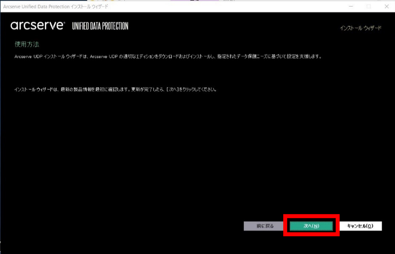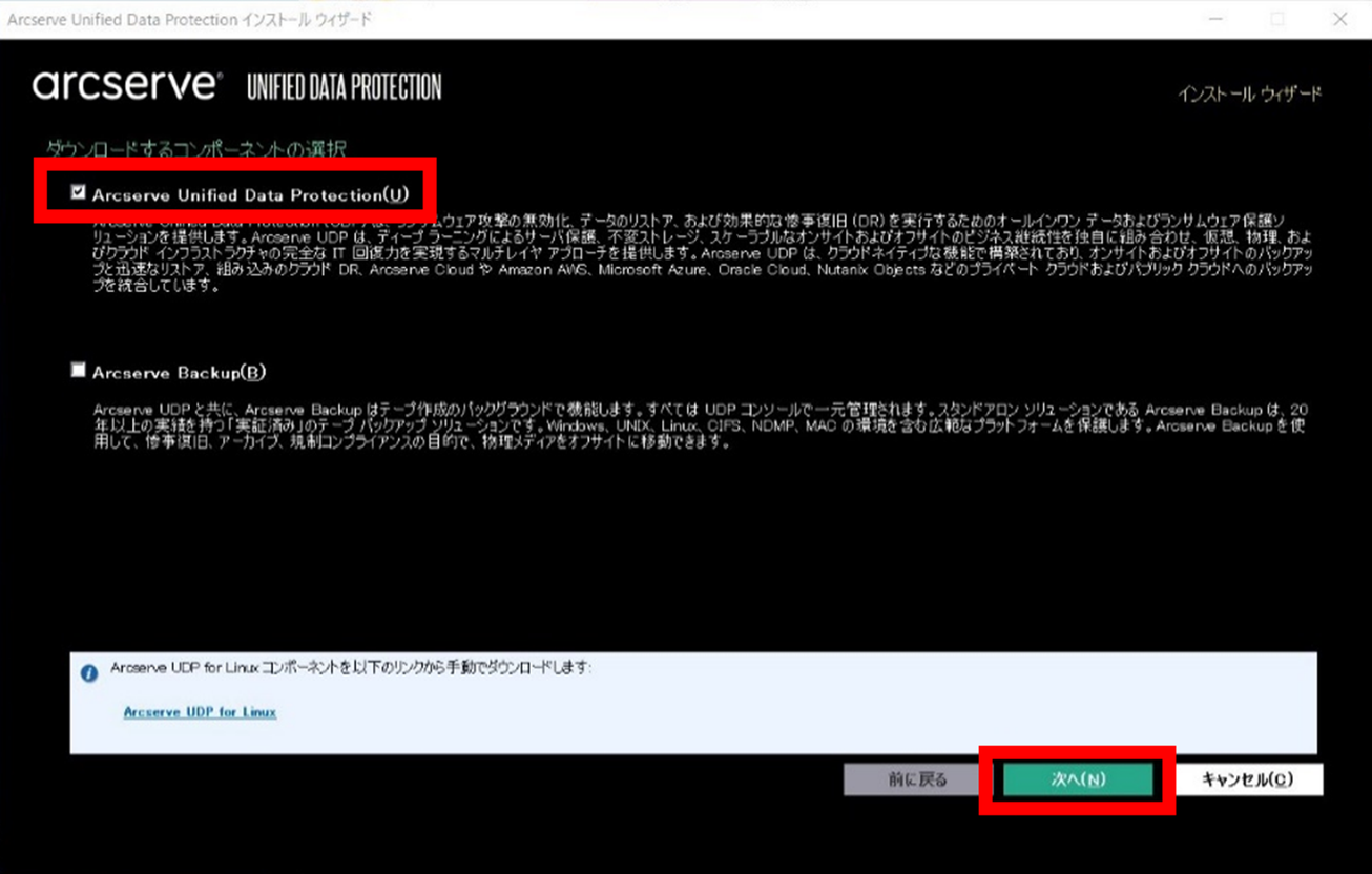 ダウンロードするコンポーネントの選択画面が表示されたら「Arcserve Unified Data Protection」にチェックし、「次へ」をクリックします。