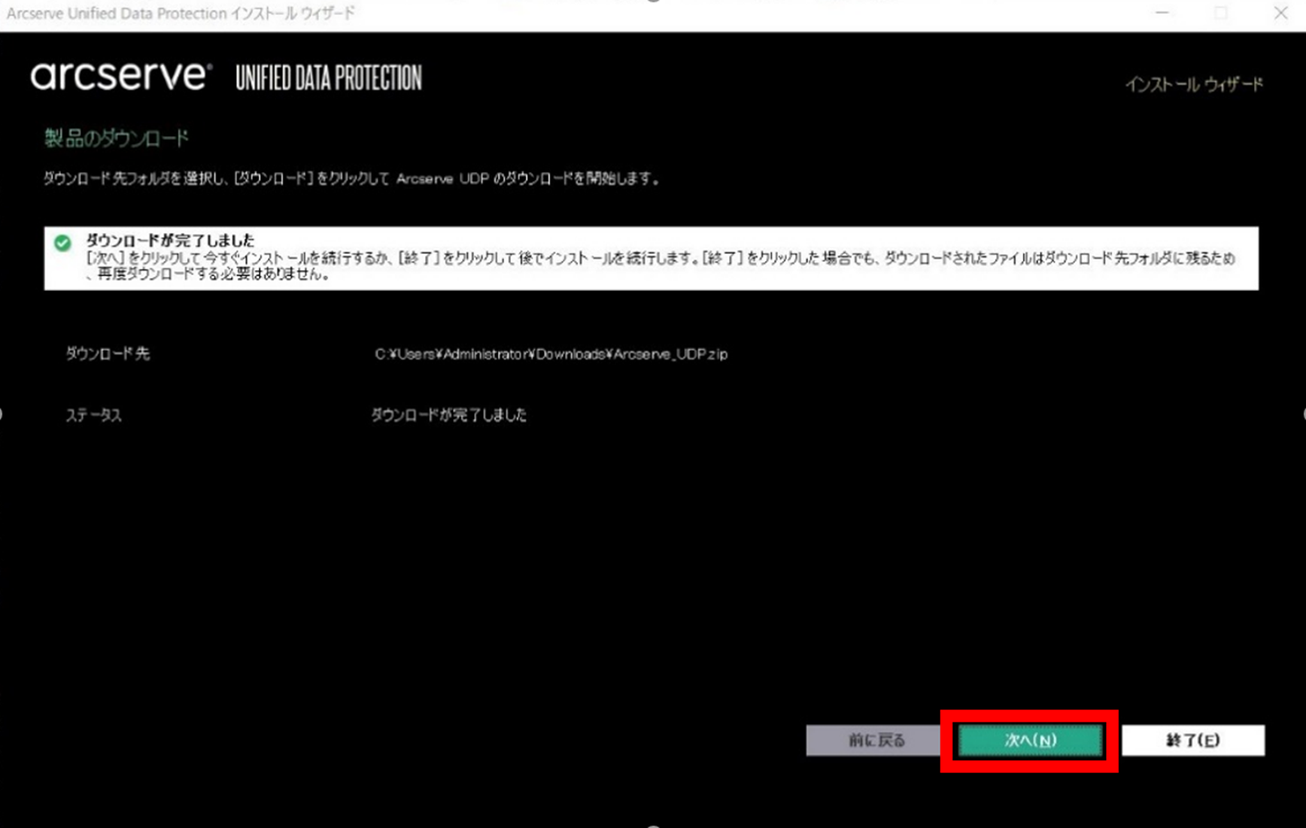 ダウンロードが完了したら、「次へ」をクリックします。