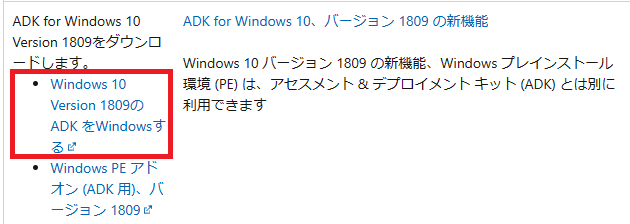 画面を下へスクロールし「Windows 10 Version 1809のADKを Windowsする」をクリックします。