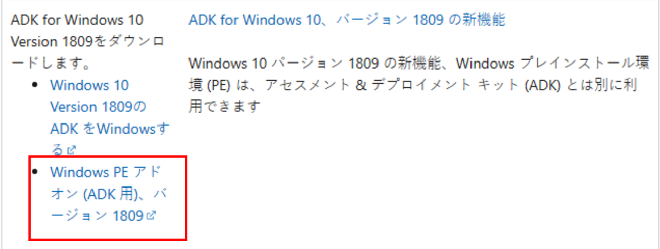 画面を下へスクロールし「Windows PE アドオン (ADK 用)、バージョン 1809」をクリックします。