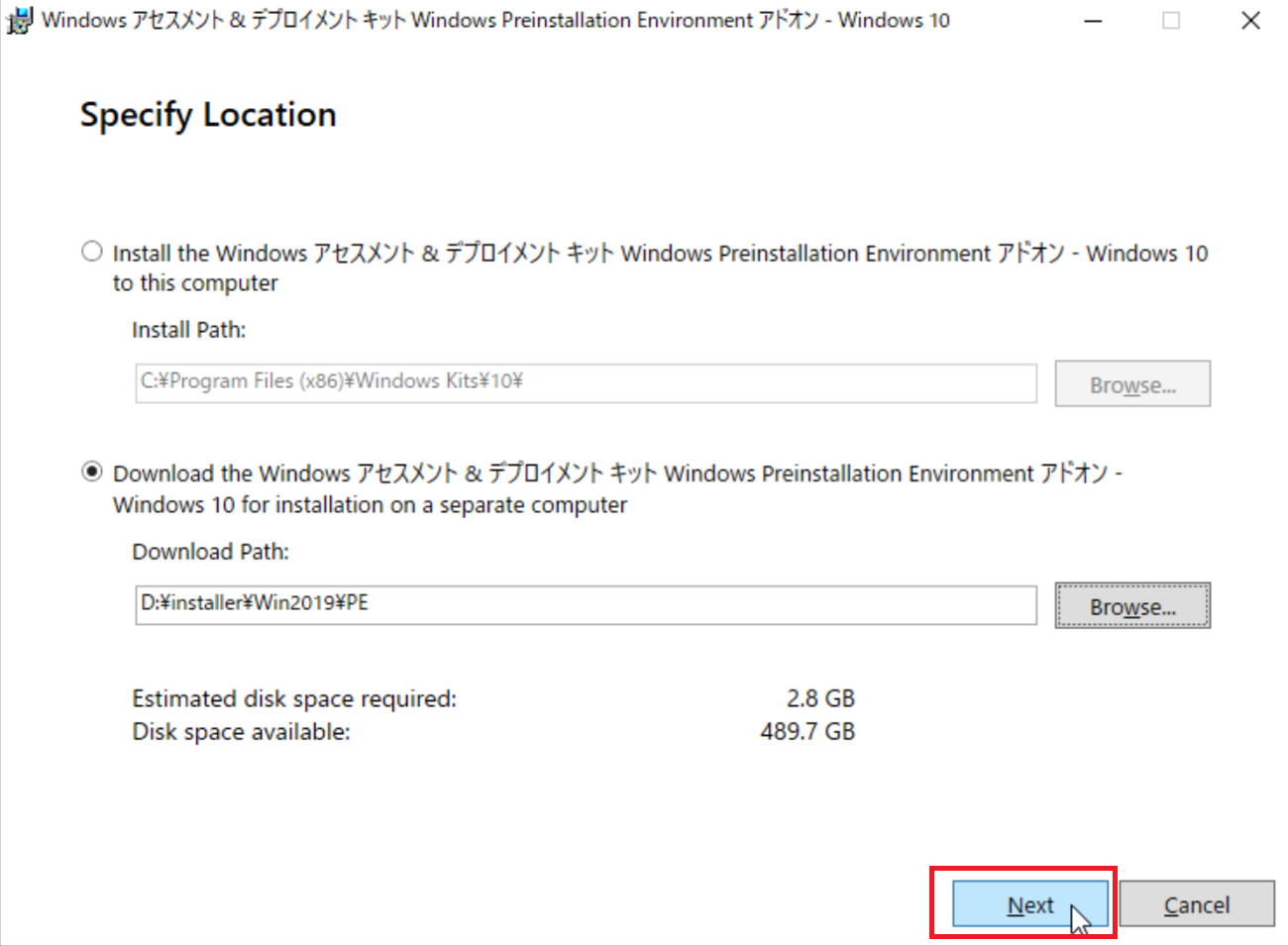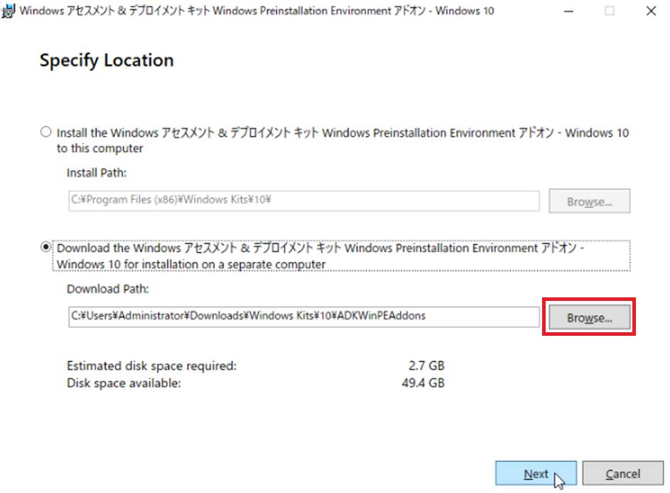 「Dwonload the Windowsアセスメント&デプロイメントキット Windows Preinstallation Environmentアドオン – Windows 10 for installation on a separate computer」にチェックを入れ、「Browse…」をクリックします。
