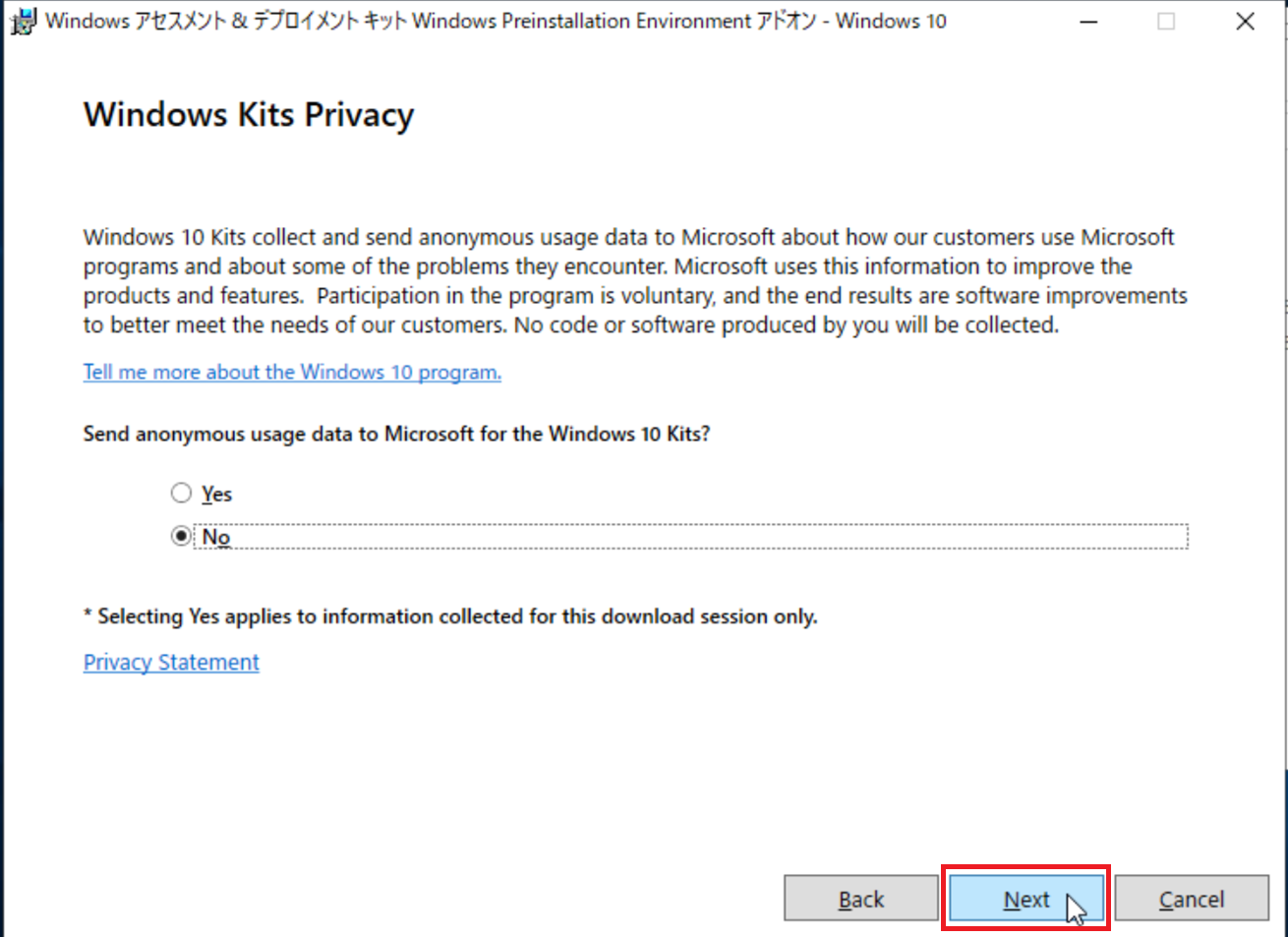 カスタマーエクスペリエンス向上プログラムへの参加にて必要に応じて、「Yes」 または 「No」を選択し、「Next」をクリックします。