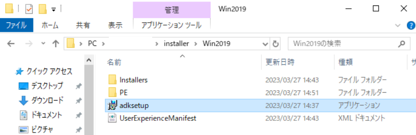 保存した「Win2019」フォルダ内の「adksetup.exe」をダブルクリックし、実行します。