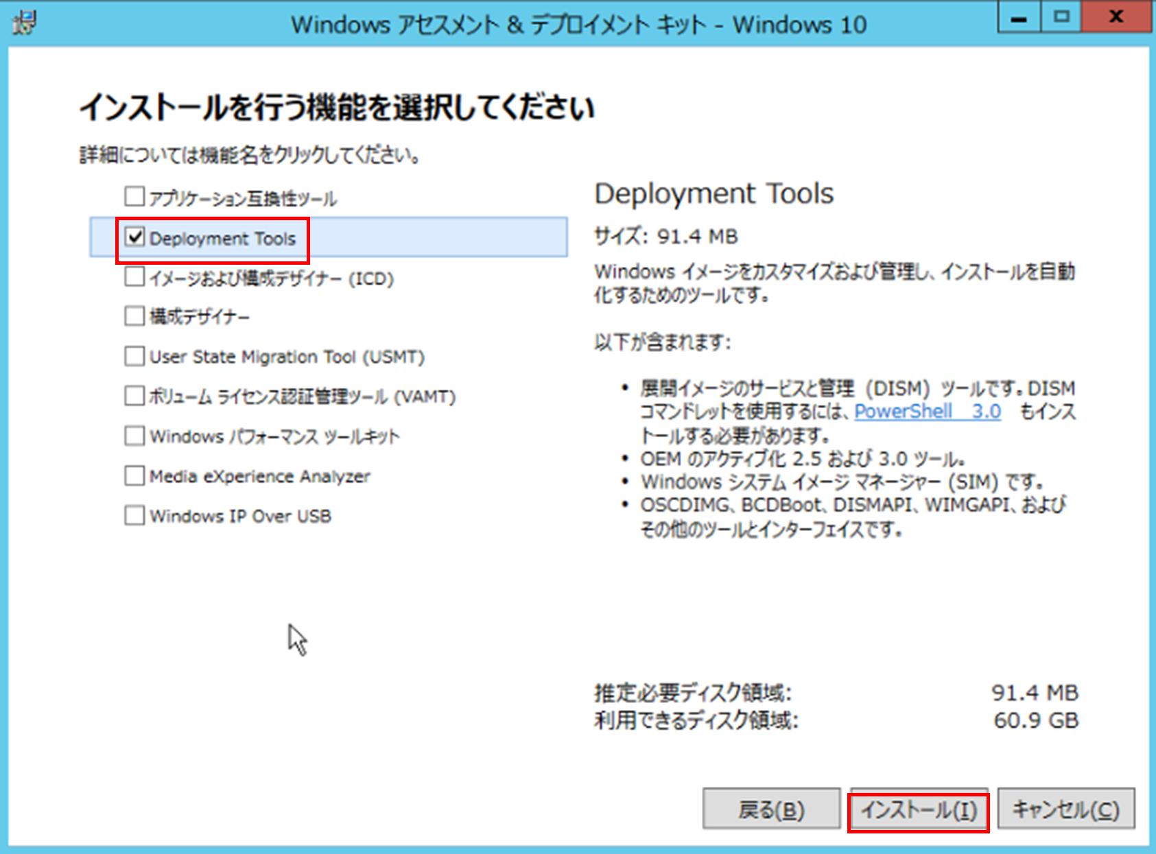 「Deployment Tools」にチェックを入れ、「インストール」をクリックします。