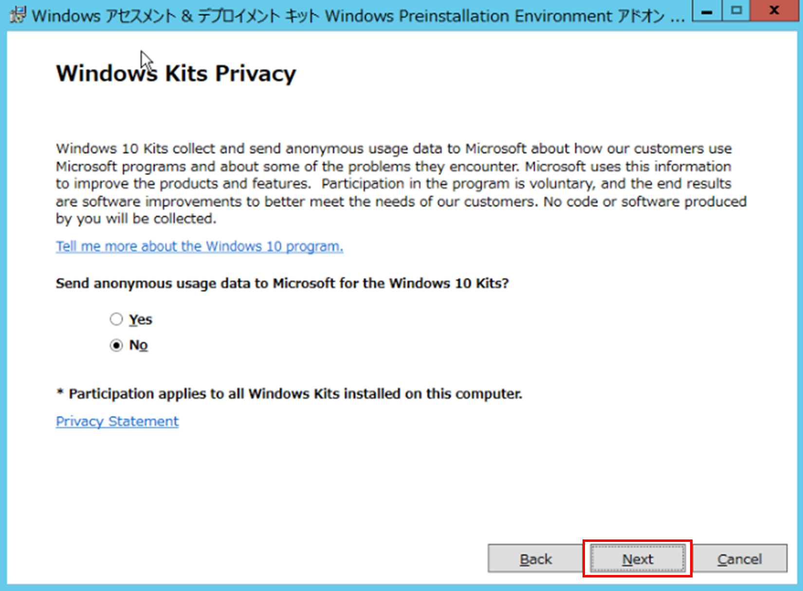 Windows 10キットの匿名の使用状況データをMicrosoftに送信しますかにて必要に応じて、「Yes」 または 「No」を選択し、「Next」をクリックします。