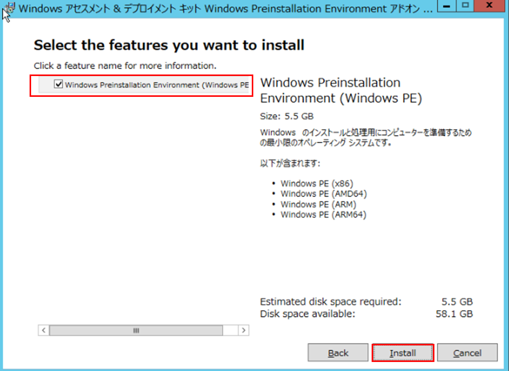 「Windows Preinstallation Environment (Windows PE)」にチェックを入れ、「Install」をクリックします。