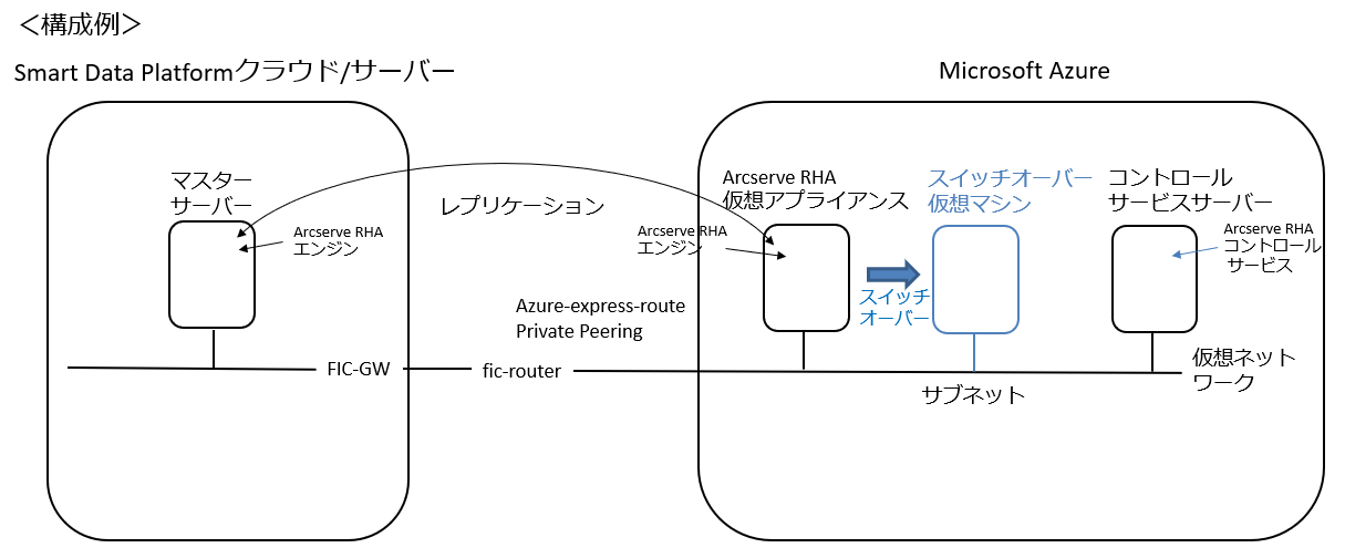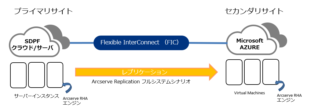 ・本構成例ではプライマリサイトのSmart Data Platformと、セカンダリサイトのHybrid Cloud with AzureをFlexible InterConnect(FIC)で接続しています。