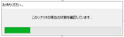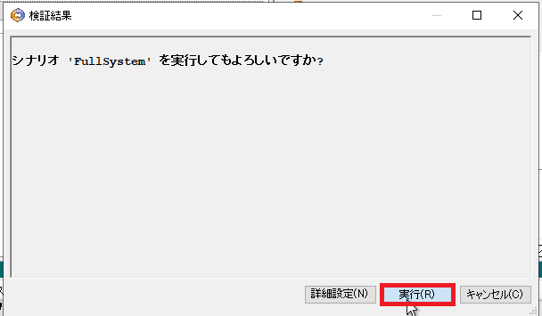 ・シナリオの状態を検証するメッセージボックスが表示された後、[検証結果] ダイアログボックスが表示されます。ここでエラーや警告が表示された場合は、問題を解決した後、再度シナリオを実行してください。[実行] をクリックします。
