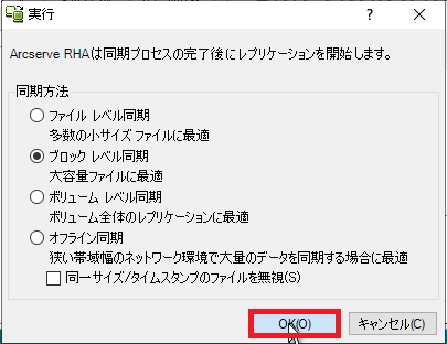 ・[実行] ダイアログボックスが表示されるので、同期方法を選択します。デフォルトでは[ブロックレベル同期] が選択されており、[同一サイズ/タイムスタンプのファイルを無視] オプションはオフになっています。[OK] をクリックします。