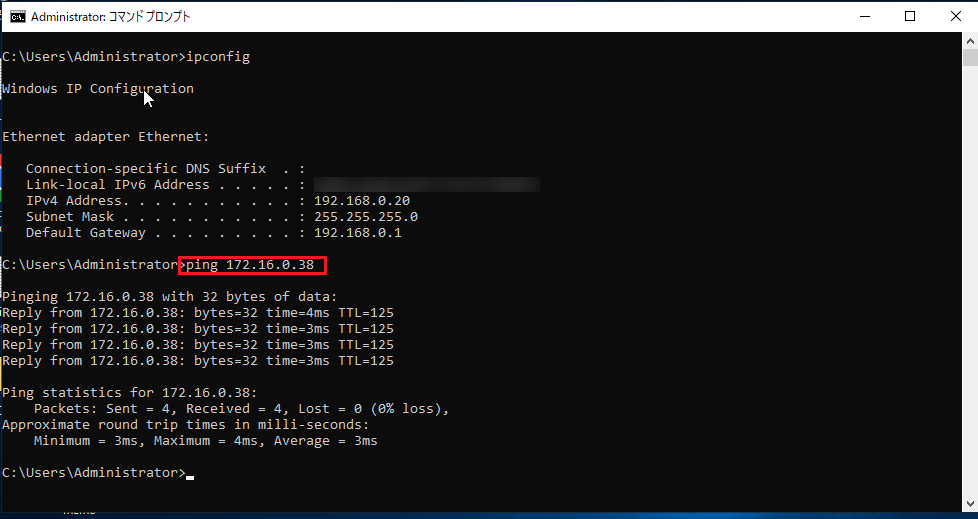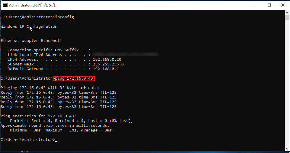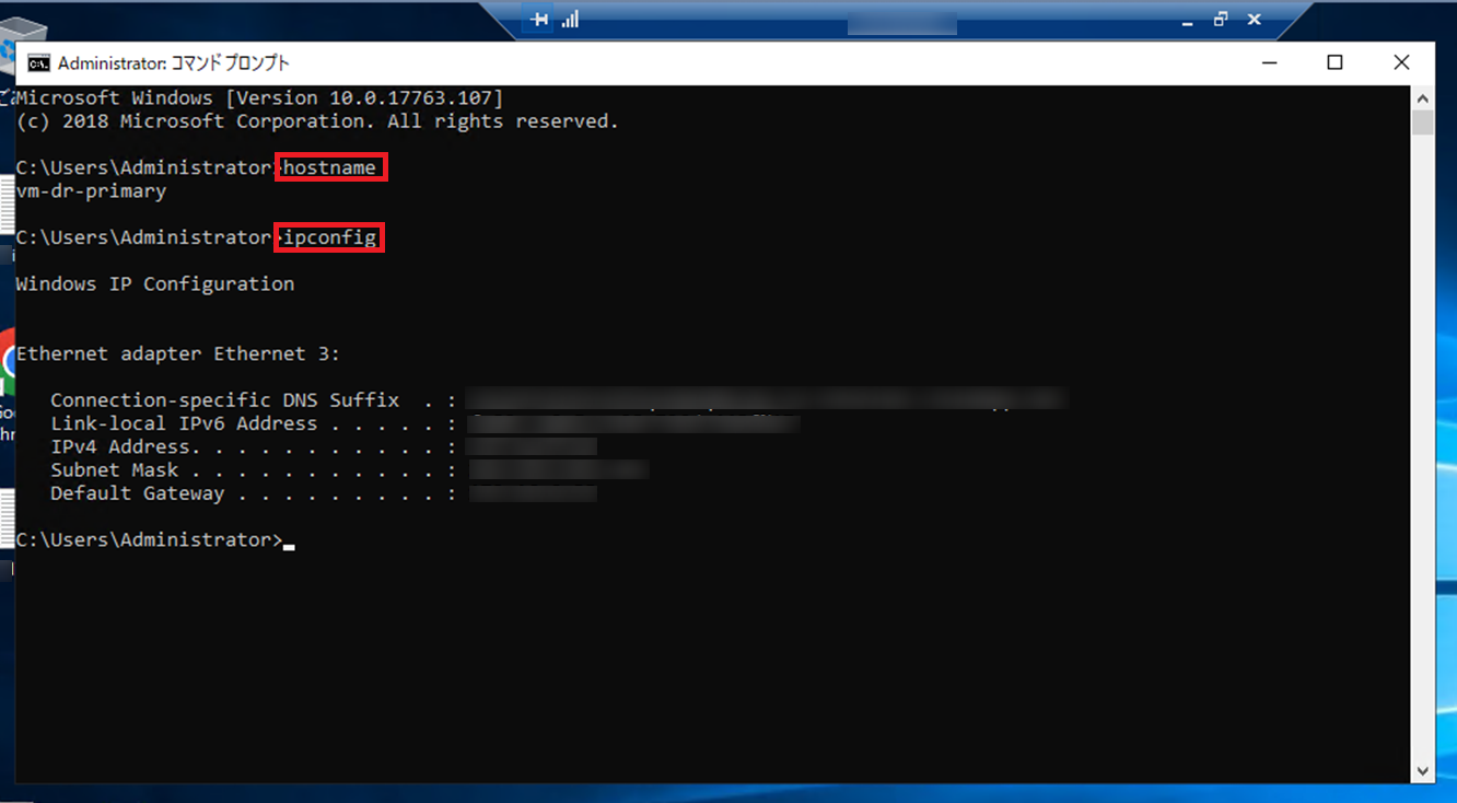 (3)セカンダリサイトのコントロールサービスサーバーで、コマンドプロンプトを開き、プライマリサイトのマスターサーバ—にPINGが通るか確認してください。