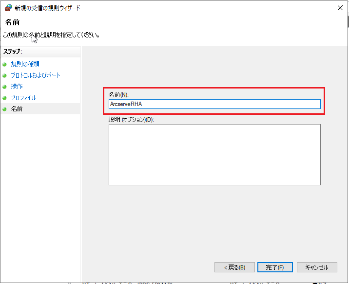 「操作」>「新しい規則」>「ポート」で、「TCP 特定のポート:25000」、「接続を許可する」を選択し、「ドメイン」、「プライベート」、「パブリック」にチェックを入れ、名前に「ArcseveRHA」と記入し、完了ボタンをクリックします。