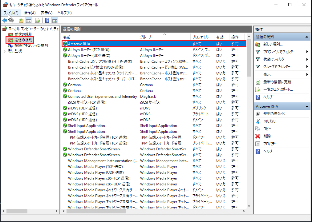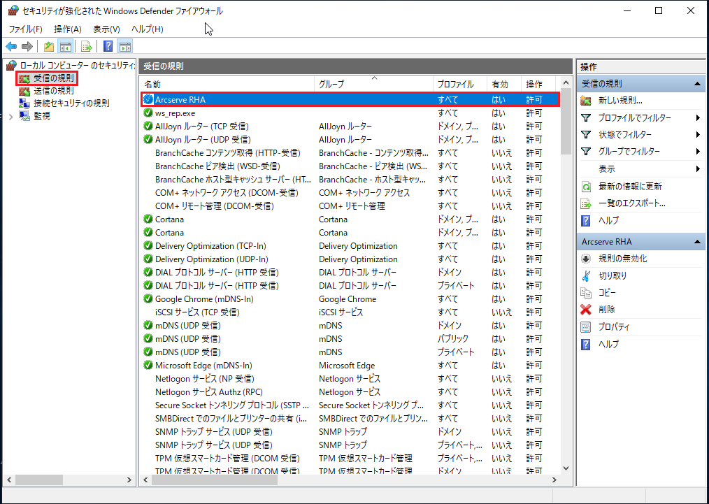 プライマリサイトのマスターサーバと同様に、Windowsファイヤーウォールにて、「受信の規則」と「送信の規則」で「ファイルとプリンターの共有(エコー要求 - ICMPv4受信)」とArcserve Replication and High Availabilityのレプリケーション用の25000番ポート通信許可設定をしてください。