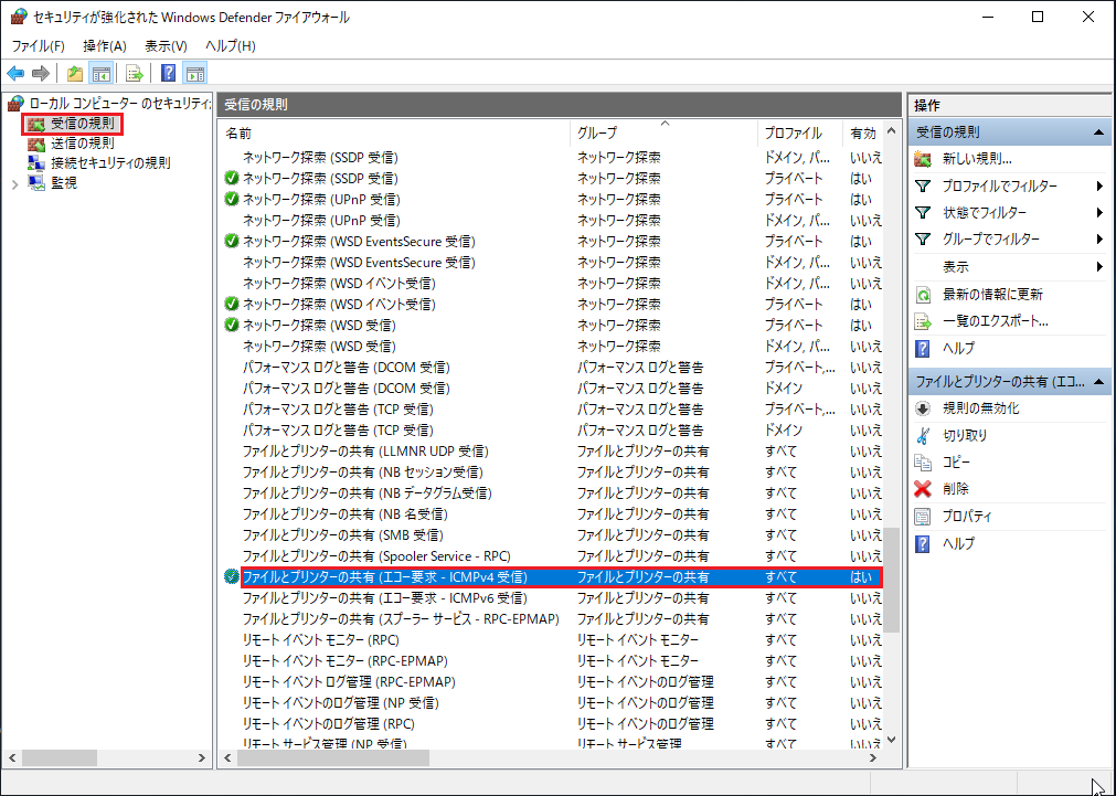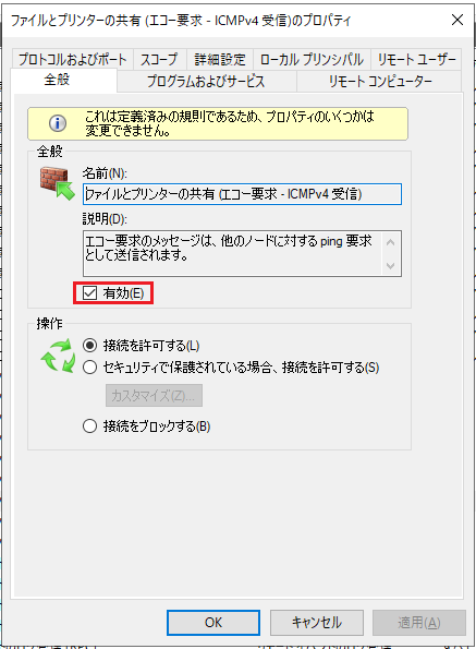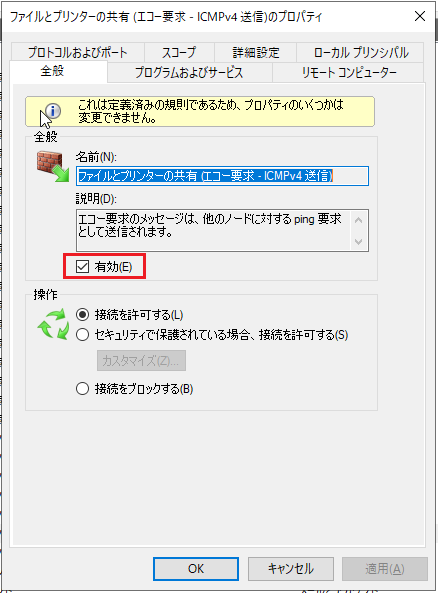 「ファイルとプリンターの共有(エコー要求 - ICMPv4受信)」を選択し、「有効」にチェックを入れ、OKボタンを押します。