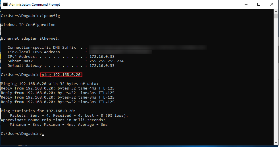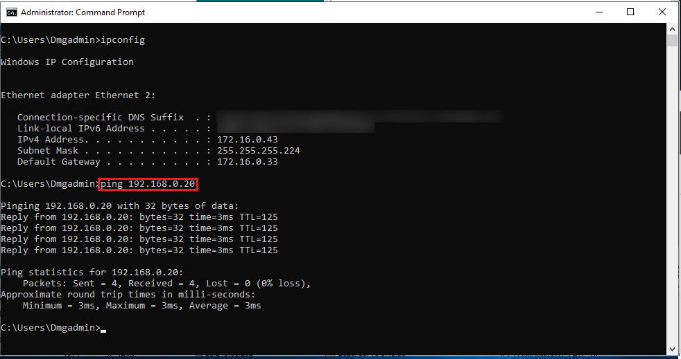 (2)セカンダリサイトのArcserve RHA 仮想アプライアンスで、コマンドプロンプトを開き、プライマリサイトのマスターサーバ—にPINGが通るか確認してください。