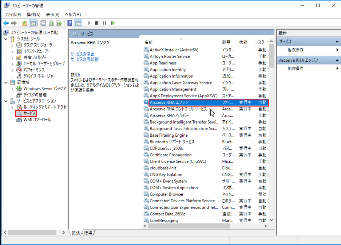 ・プライマリサイトのマスターサーバーで“Arcserve RHA エンジン” の登録とサービス開始状態を確認します。