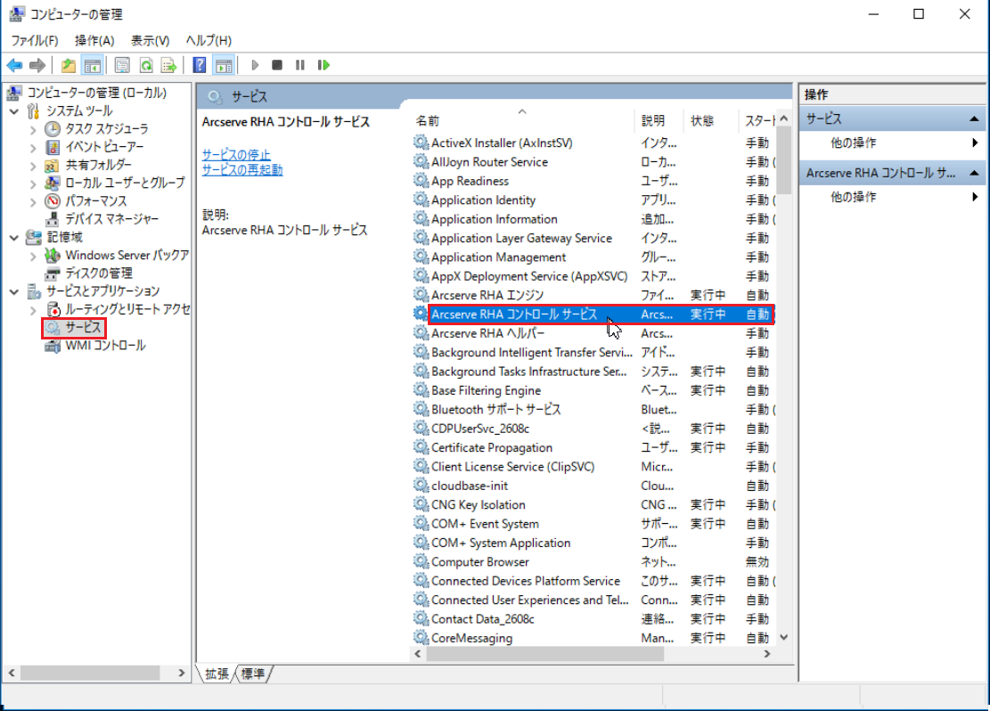 ・セカンダリサイトのコントロールサービスサーバーで“Arcserve RHA コントロールサービス” の登録とサービス開始状態を確認します。