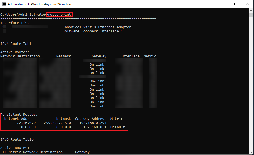 “route print”を再度実行し、ルートが追加されていることを確認してください。