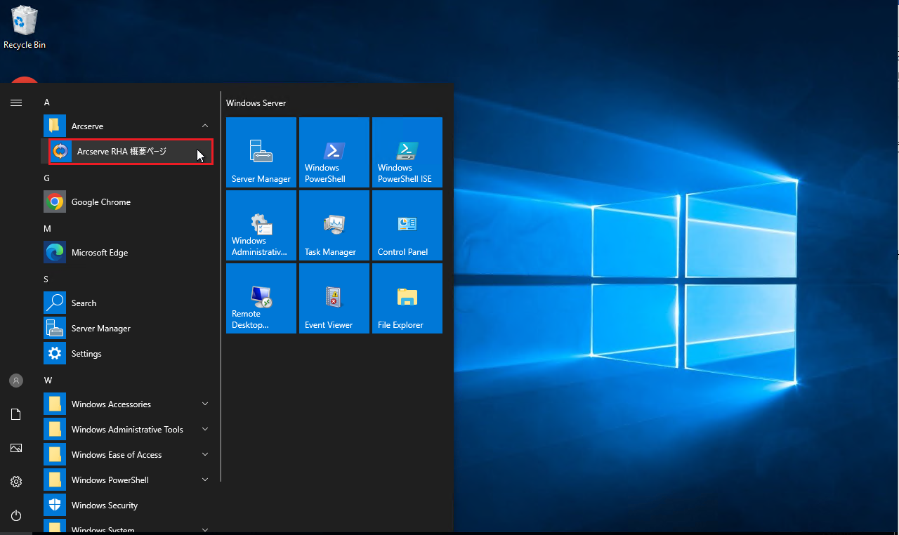 ・セカンダリサイトのコントロールサービスサーバーで、スタートメニューから“Arcserve RHA 概要ページ” をクリックします。