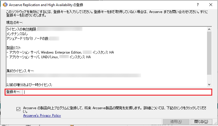 ・SDPFポータル上からArcserve UDP Premium Plus Editionライセンスをお申し込みの方は、Arcserveライセンスの「詳細表示」より、”ソケットキー(High Availabiliry)”をご確認いただき、こちらにご登録ください。