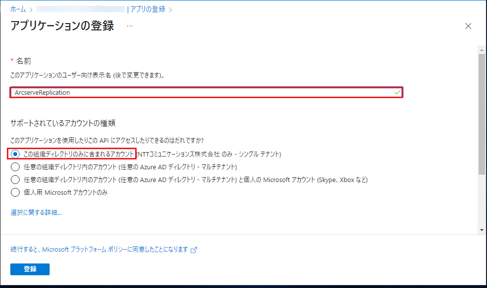 ・「アプリケーションの登録」画面で、アプリケーションの名前に”ArcserveReplication”と記述し、”サポートされているアカウントの種類”でデフォルトの”この組織ディレクトリのみに含まれるアカウント”を選択し、登録ボタンをクリックします。