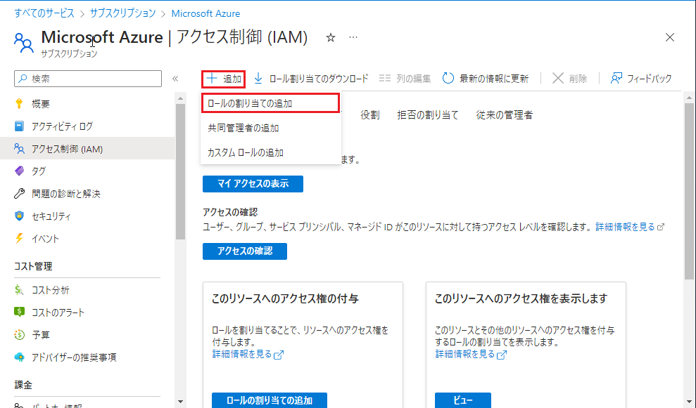 ・「追加」をクリックし、「ロールの割り当ての追加」を選択します。
