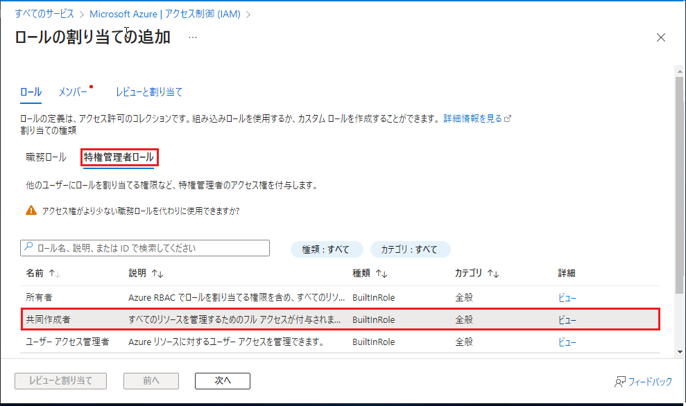 ・「特権管理者ロール」から”共同作成者”を選択し、「次へ」ボタンをクリックします。