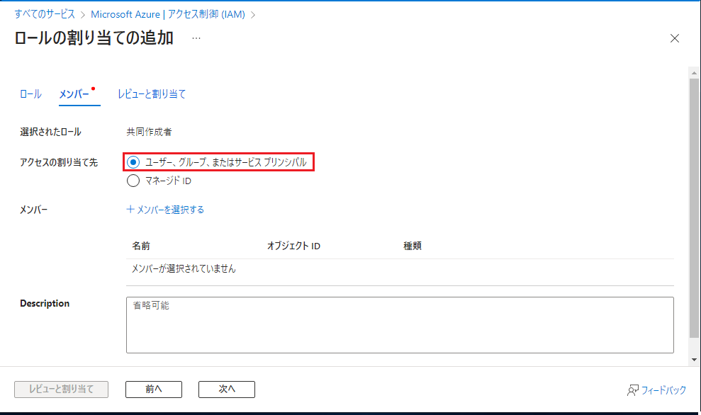 ・「アクセスの割り当て先」で”ユーザー、グループ、またはサービスプリンシパル”を選択します。