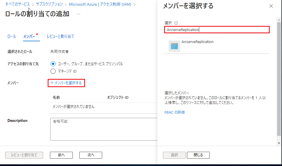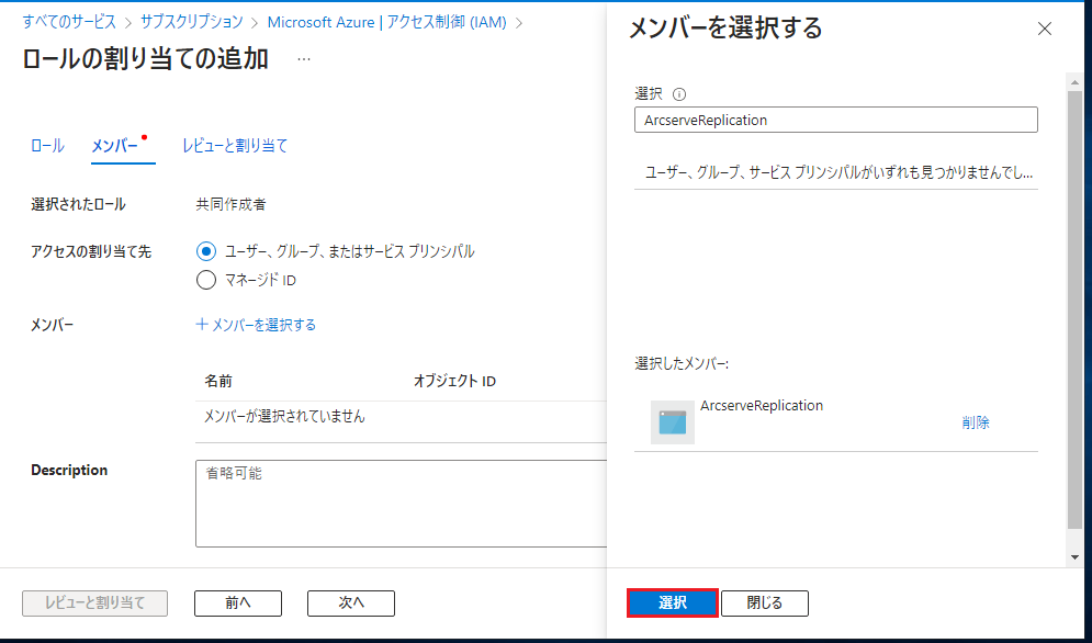 ・「+メンバーを選択する」をクリックし、選択ボックスから”ArcserveReplication”を記入し、選択します。