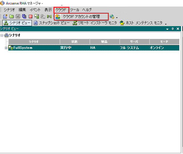 ・Arcserve RHA マネージャの [クラウド] - [クラウド アカウントの管理] をクリックします。
