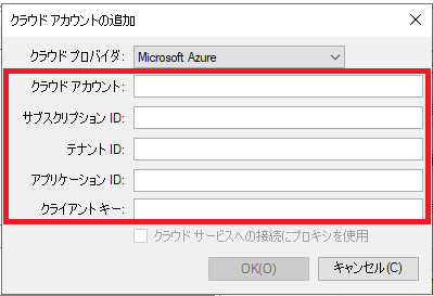 ・Azure ポータルから確認した情報をもとに、赤枠内の情報を入力し、[OK]をクリックします。