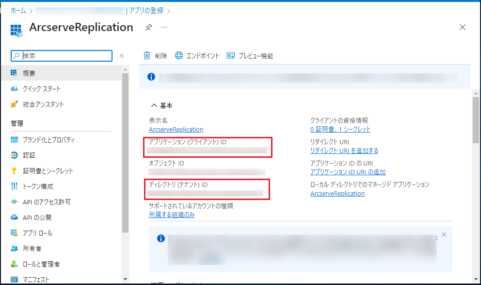 >テナントID とアプリケーションID:Azureポータル画面:ホーム>ActiveDirectory>アプリの登録>ArcserveReplication