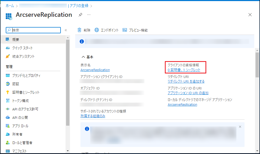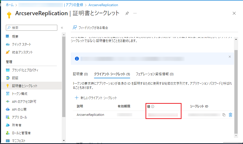 >クライアント キー:Azureポータル画面:ホーム>ActiveDirectory>アプリの登録>ArcserveReplication>クライアントの資格情報をクリックします。