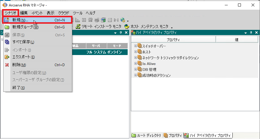 ・Arcserve RHA マネージャの [シナリオ作成] ボタン、またはメニューの [シナリオ] - [新規] をクリックします。