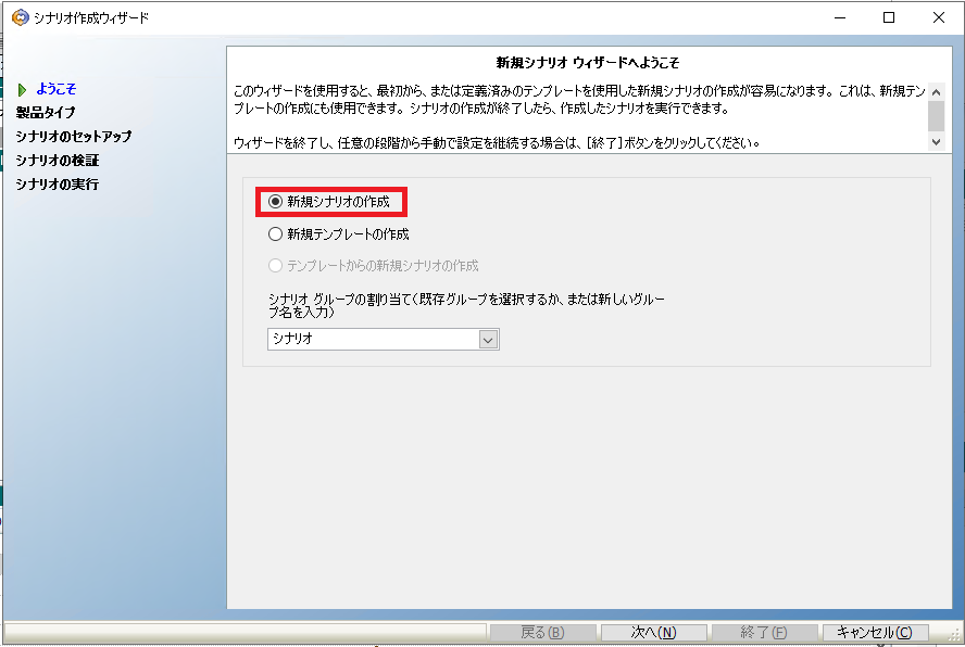 ・シナリオ作成ウィザードが表示されます。「新規シナリオの作成」が選択されていることを確認し、[次へ]をクリックします。