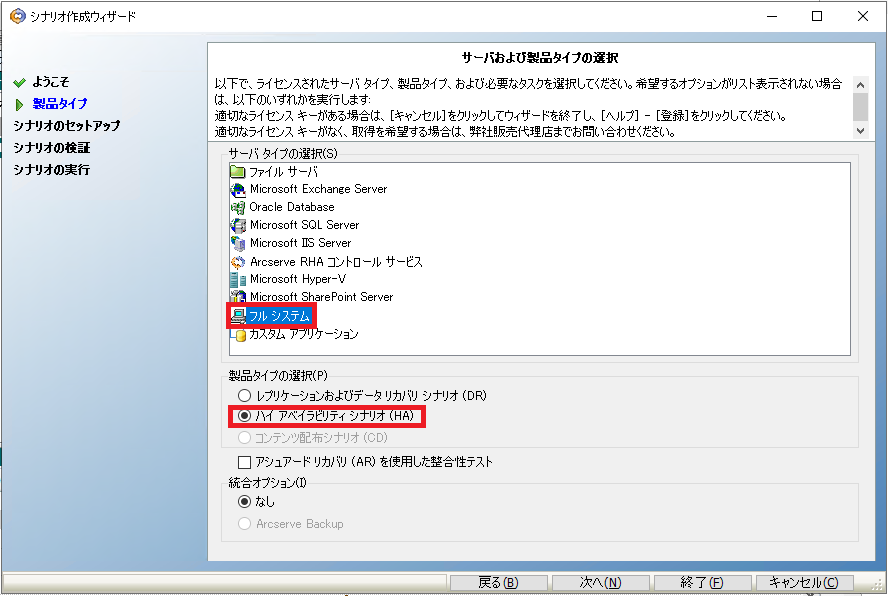 ・[サーバタイプの選択] で「フルシステム」を、[製品タイプの選択] で「ハイ アベイラビリティ シナリオ(HA)」を選択し、 [次へ] をクリックします。