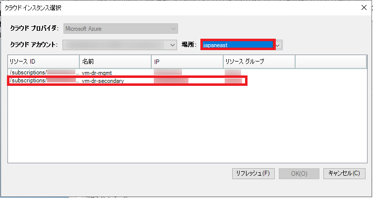 ・クラウドアカウントの場所(リージョン)を選択し、一覧にArcserve RHA 仮想アプライアンスが表示されたら、それを選択して[OK] をクリックします。