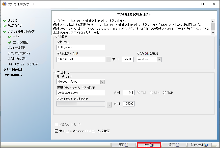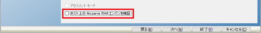 ・[ホスト上のArcserve RHA エンジンの検証] にチェックが入れた場合は、それぞれのマシンのエンジン検証を行います。エンジンが各サーバに問題なくインストールされていることを確認します。[次へ] をクリックします。