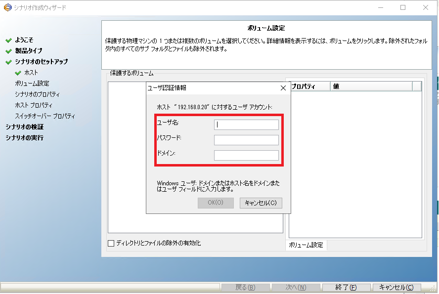 それぞれのマシンのユーザ名、パスワード、ドメインをすべて入力し、[OK] をクリックします。