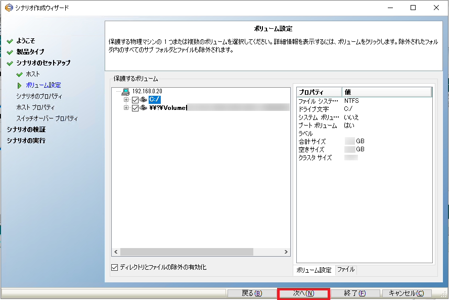 ・[ボリューム設定] 画面にて、指定したマスタ サーバのボリューム情報が表示されます。除外したいボリュームがある場合はここで除外の指定をします。ただし、ディスクアイコン上に と表示されたシステム ボリュームは除外の対象にはできません。[次へ] をクリックします。