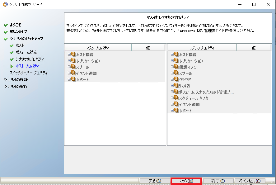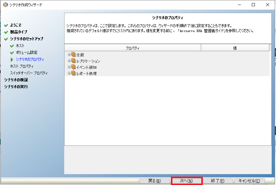 ・[シナリオのプロパティ] 画面で、シナリオの設定を変更することができます。ここではデフォルトのまま進めます。 [次へ] をクリックします。