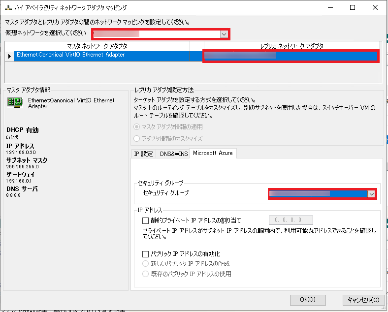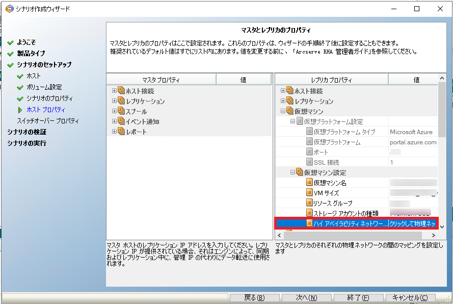 スイッチオーバーしてAzure 上で仮想マシンが起動した際に、ここで設定したネットワーク情報を元に起動します。Azure 環境にそぐわないネットワーク設定を行った場合、スイッチオーバーに失敗して仮想マシンが起動しない場合がありますので注意してください。その他、Azure でのフルシステム シナリオで設定できるプロパティの詳細は、仮想サーバ環境操作のオンライン ヘルプ「フルシステム Azure シナリオでの追加プロパティの設定」をご参照ください。