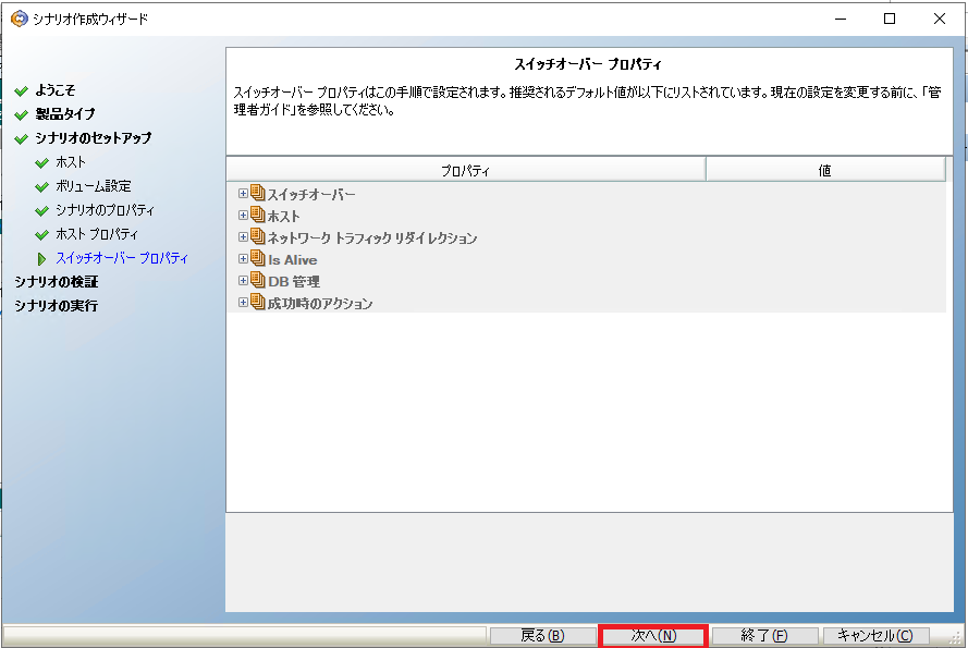 ・スイッチオーバー プロパティを設定します。設定が完了したら [次へ] をクリックします。