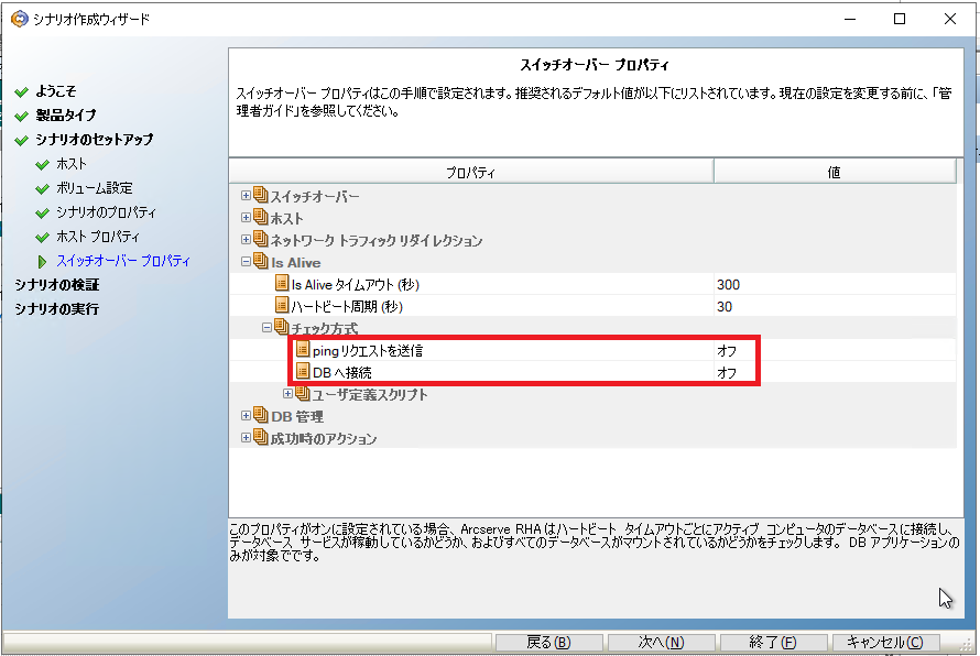 なお、Azure 上の仮想アプライアンスはグローバルIP を持って機能していますが、この仮想アプライアンスからマスタサーバに疎通するために、お客様側でVPN やルータールーティング、あるいはグローバルIP の準備が必要です。これらが準備できない場合は、仮想アプライアンスから死活監視ができないため、Is Alive のチェック方式の「ping リクエストを送信」と「DB へ接続」を [オフ] にしてください。また、Azure への移行目的でフルシステム シナリオをご使用の場合も、死活監視が不要のため、同様に[オフ] にしてください。