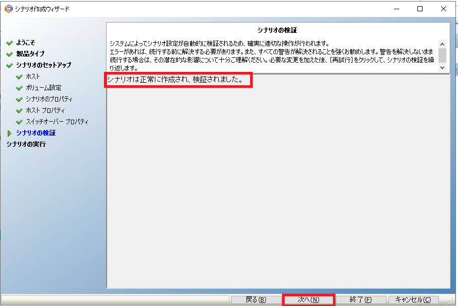 ・[シナリオの検証] 画面にて、シナリオに設定した内容に間違いがないか、またAzure 環境の設定状況に間違いがないかの確認が行われます。エラーや警告が表示された場合は、問題を解決した後、再試行してください。[次へ] をクリックします。