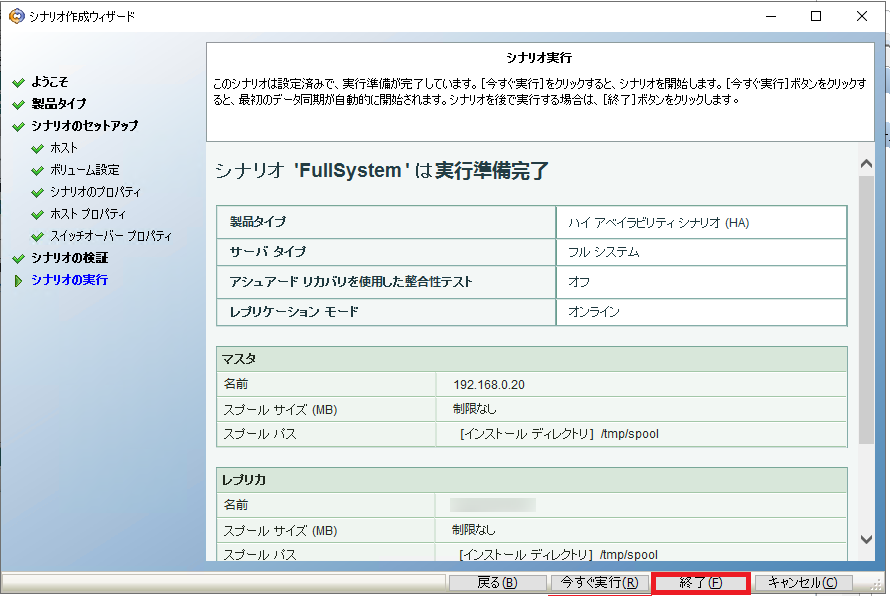 ・[シナリオ実行] 画面にて、シナリオの概要が表示されます。内容を確認の上、問題が無ければ [終了] をクリックします。