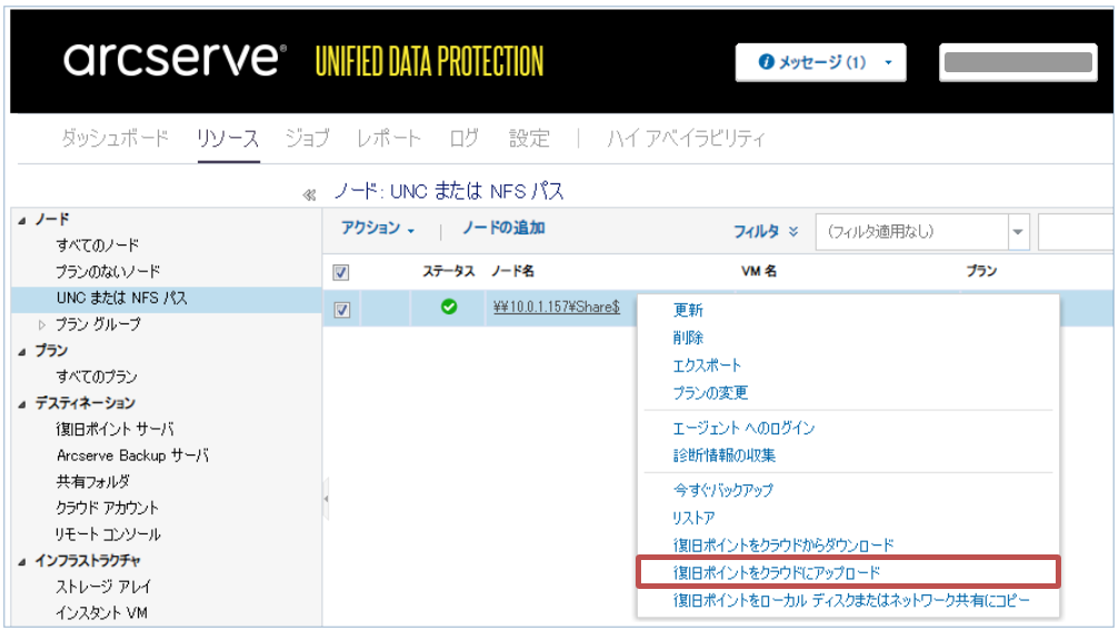 - 「リソース」内の[UNCまたはNFSパス]から、ノードを右クリックし、[復旧ポイントをクラウドにアップロード]をクリックします。