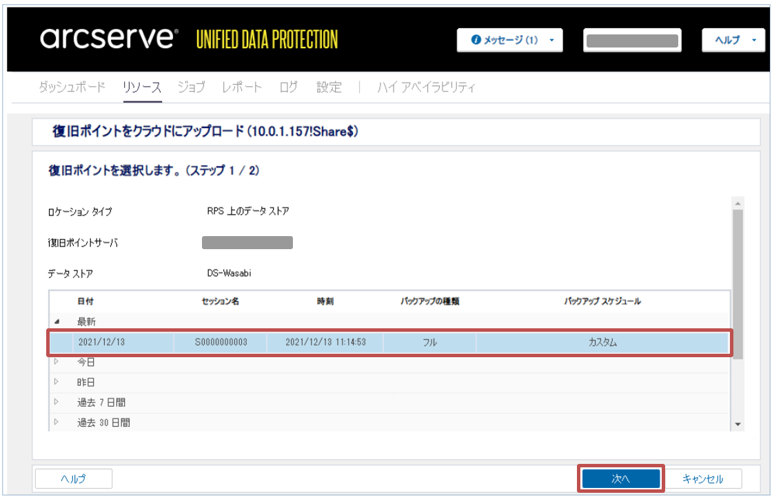 - アップロードする復旧ポイントを選択し、[次へ]をクリックします。