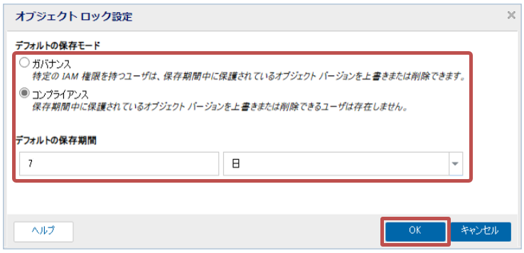 - 「デフォルトの保存モード」に[ガバナンス]または[コンプライアンス]を選択し、「デフォルトの保持期間」を入力後、[OK]をクリックします。本構成では[コンプライアンス]を選択し、デフォルトの保持期間を「7日」に設定します。