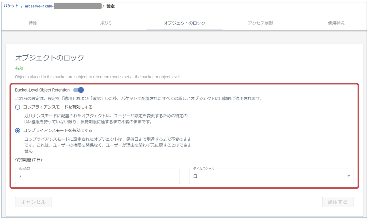 - Wasabiのバケットの設定を確認し、オブジェクトロックが有効であることおよび手順4の値が適用されていることを確認します。